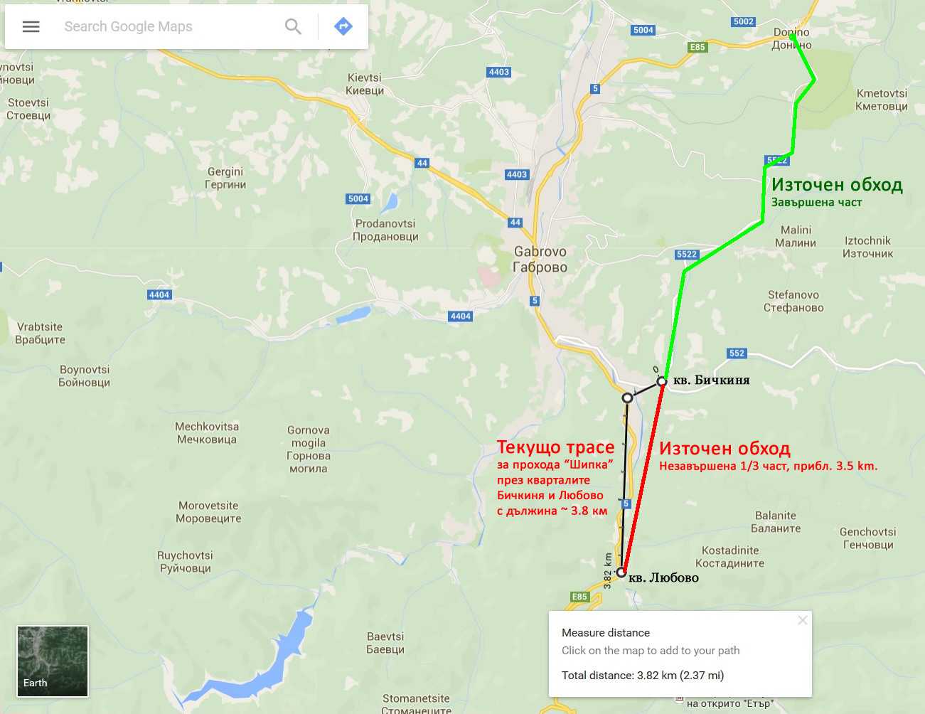 2. За да достигне до съществувашия проход "Шипка", транзитното автомобилно движение преминава през Източен обходен път, който е завършен на 2/3, както се вижда от картата. От началото на 90-те години, заради оставащата незавършена прибл. 1/3 част от него движението е пренасочено за прибл. 3.8 км. през кв. Бичкиня и кв. Любово. През 2008 г. граждани от кварталите Бичкиня и Любово, със съдействието на бившия кмет на Габрово Иван Ненов, който е от кв. Бичкия, и не без съдействието на кмет Томислав Дончев изпращат петиция до Еврпейският Парламент, с искане за премахване на движението за Шипка от кварталите Бичкиня и Любово.